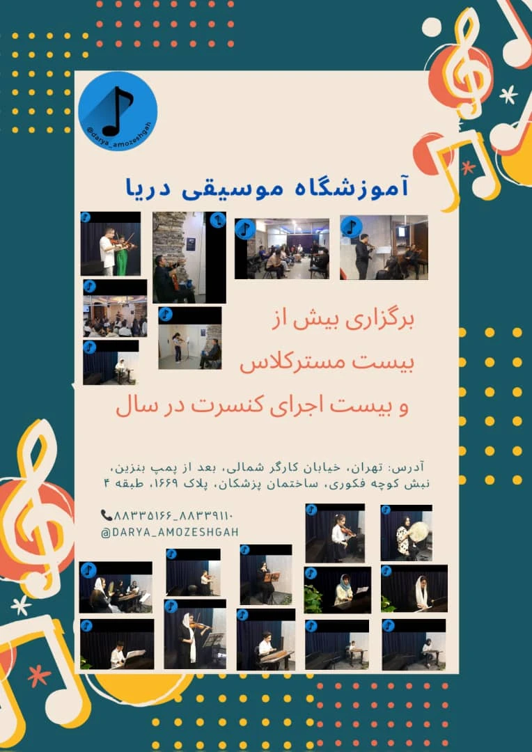 خیابان کارگر شمالی،بالاتر از پمپ بنزین، نبش کوچه زمرد ،پلاک ۱۶۸۳, آموزشگاه موسیقی دریا