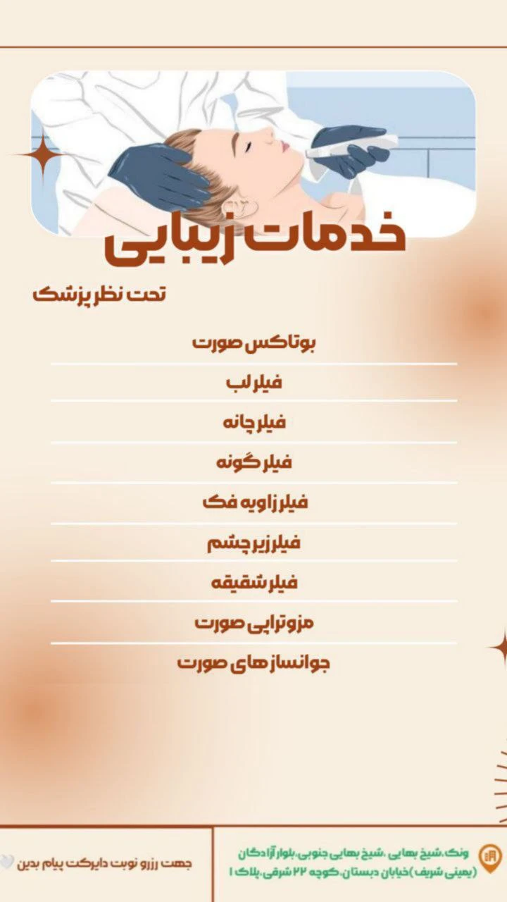 زاویهسازی فک و غبغب , فیلر بینی , ماساژ صورت , لیفت صورت با نخ , فیلر باسن