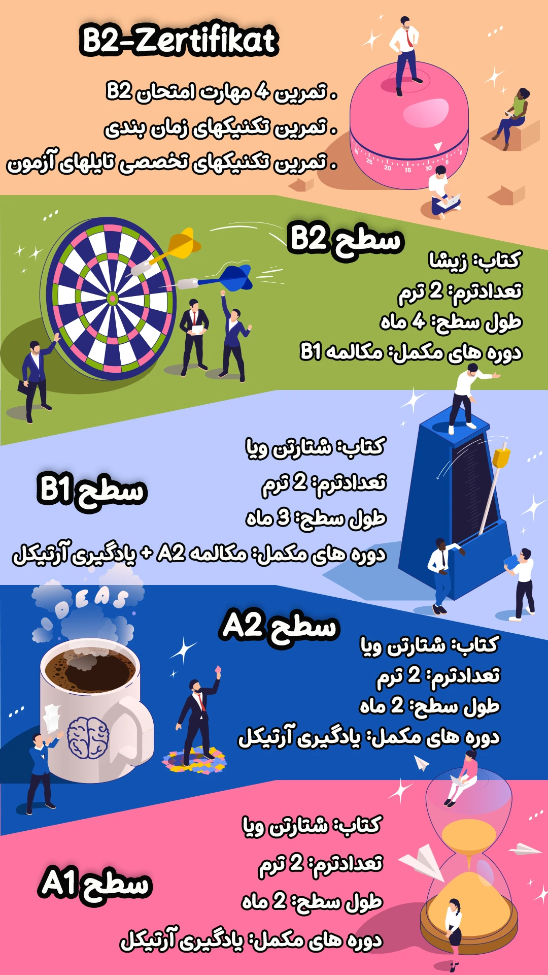 تمرکز ویژه بر تقویت مهارت مکالمه و آمادگی برای موقعیتهای واقعی زندگی و کار در محیطهای آلمانیزبان، این دورهها را از آموزشهای معمول متمایز میسازد.