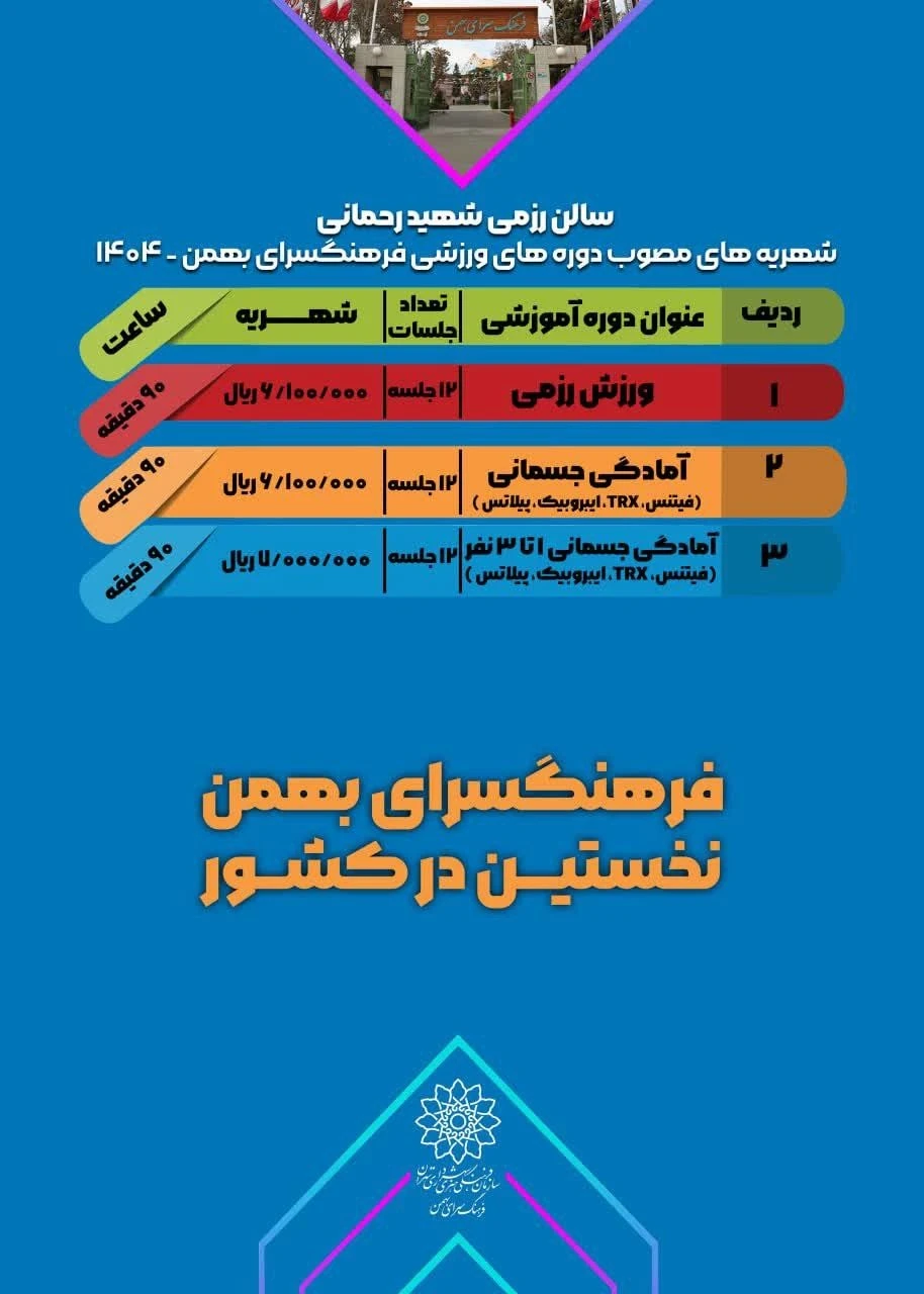 فضایی پویا و پرانرژی برای بانوان علاقهمند به ورزش و تناسب اندام در فرهنگسرای بهمن فراهم شده است. این مجموعه با هدف ارتقای سلامت جسمی و روحی، محیطی امن و حرفهای را برای تمرینات متنوع ورزشی ایجاد کرده است.