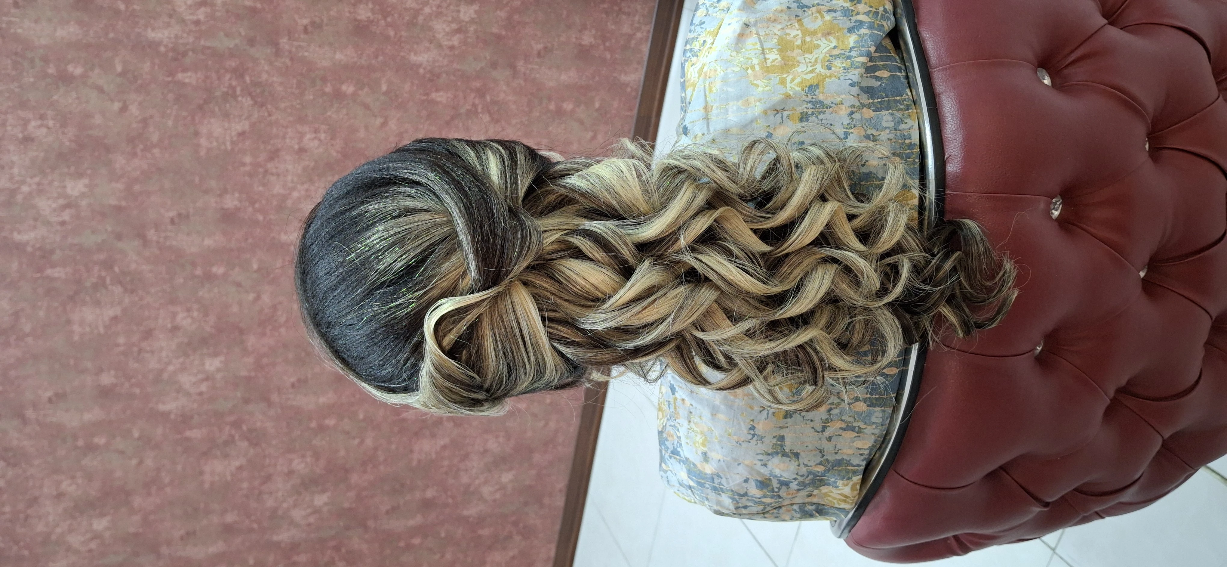 - شینیون و بافت مو: شامل براشینگ، کرلی، بافت آفرو، و انواع استایلها با موی اضافه.